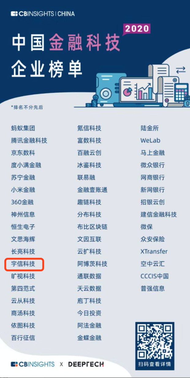 據了解,CB Insights是全球知名的市場數據研究平臺,由它發起的全球金融科技榜單評選,已成為世界上最具影響力的金融科技榜單之一。每年,CB Insights中國團隊都會基于企業自身實力、外界態度、發展趨勢和合作表現等四個方面的維度,綜合評選出中國金融科技行業的佼佼者。此次與宇信科技一同上榜的還有螞蟻集團、京東數科、騰訊金融科技、360金融、度小滿金融等一大批優秀企業。
